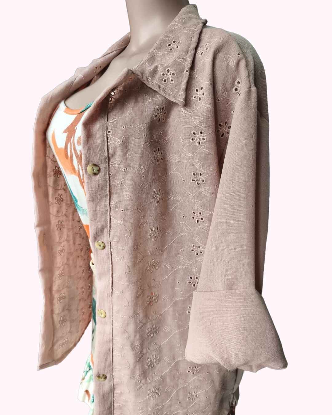 Sobrescamisa en Lino con Broderie en la parte del frente y cuello en color tostado, en talle único que va hasta el XL.